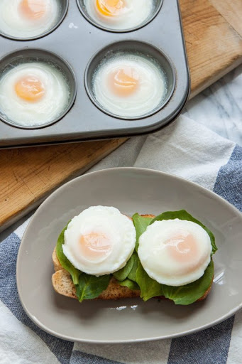 Preheat oven to 350. Break 1 egg into a cup. Place 1 Tablespoon of water in each standard muffin cup then add a cracked egg. Repeat this for however many poached eggs you want to make. Bake for 11-13 minutes.