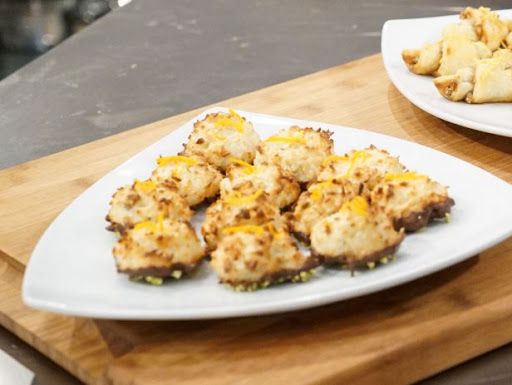 Dip the bottom of each cooled macaroon in the melted milk chocolate, and lightly roll in pistachios. Return to the baking sheets and let set. Squeeze fresh orange juice and sprinkle orange zest over the tops.