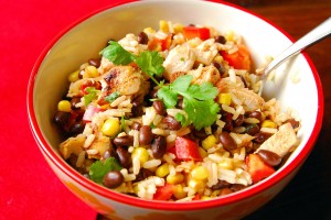 1. In large platter or individual bowls lace spinach or lettuce leaves. Top with rice, beans, tomatoes, chicken, corn chilies and olives.