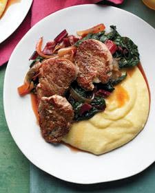4. Pour 4 cups polenta into a lightly oiled 8-inch square baking dish; cover with plastic wrap and refrigerate for later use. Stir butter into remaining polenta. Season pork and vegetables with salt and pepper and serve over polenta.