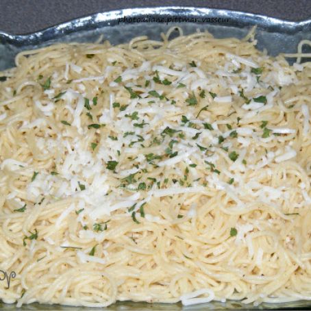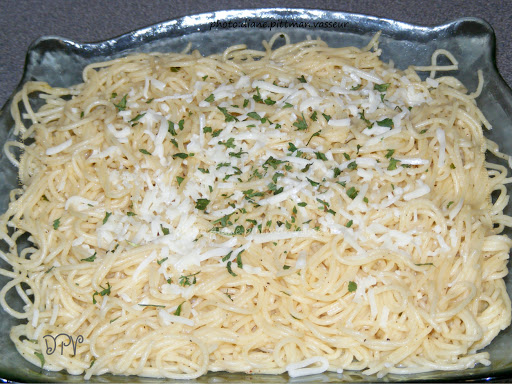 Transfer pasta to a serving dish (or back to the pot that it was cooked in) then pour the garlic butter mixture over the pasta and toss to coat. Add the Parmesan cheese and parsley and toss well. Transfer pasta to a serving dish if you were mixing it in the pot.