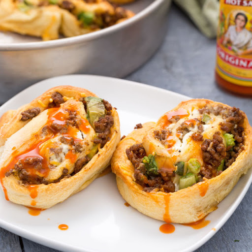 Spread sour cream all over Crescent rectangle, then scatter with cooked beef, scallions, pepper jack, and cheddar.