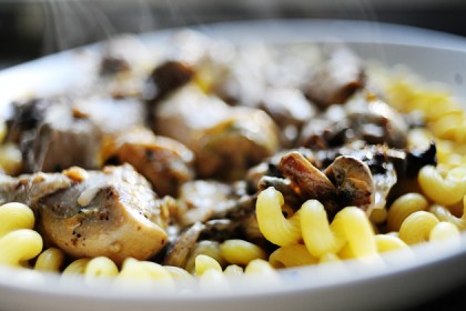 Add sliced mushrooms to pan with the garlic, and stir around and cook for a couple of minutes. Add wine and cook for a minute while it evaporates.
