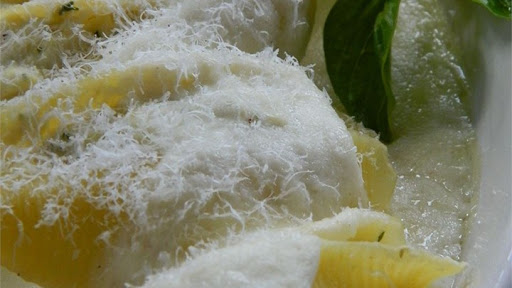 Pour remaining white sauce over the tops of the shells and sprinkle with Parmigiano-Reggiano cheese.