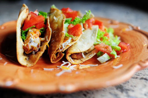 To fry the tacos, heat a couple of inches of canola oil in a heavy skillet over medium-high. Place some chicken in the middle of a tortilla, then fold tortilla in half. Clamp the tortilla shut with a pair of heat-proof metal tongs, then carefully lay the taco---one side down---in the oil. As you lay it in the oil, use the tongs to hold the top side down for a few seconds to form it in place. Once it stays put, repeat with two other tacos. Turn tacos after 30 to 45 seconds, or when each side gets light golden brown (not too brown.)