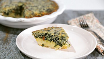 To the prepared pie dish, add the hash brown mixture. Using the back of a spoon, press into an even layer. Place in oven and bake for 15 minutes to par bake, until golden brown around the edges.