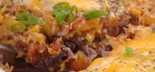 In an 8-inch-by-8-inch baking dish, add the rice, black beans, corn, salsa, chicken broth, chili powder and oregano. Stir to combine.