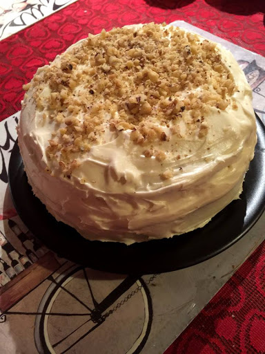Place a cake layer on a plate.. coat top with icing.. put second layer on top of first, put icing on top.. and then third layer on and put icing on the top and sides with the cream cheese frosting. Sprinkle remaining chopped pecans on top. I suggest putting cake in refrigerator for an hour (I put mine covered overnight) before cutting to make it easier to cut but if you are serving right away its still good, just may not be as firm! (Pictures are of cutting it before it was firm!)