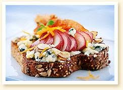 Top each sandwich with half a poached pear, sliced, about 1/4 cup of candied almonds, and 1 tablespoon bacon pieces. Serve open-faced.