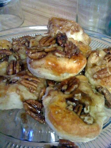 In an 8×8 pan layer brown sugar, honey, cinnamon and pecans. Dot with little chunks of the butter. Place biscuits on top.