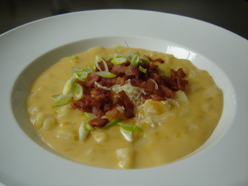 Add 1 cup Cheddar cheese to the soup and simmer until melted. By this time the potatoes should be tender and falling apart. If not, continue to cook until the soup is as thick as you like it.