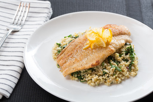 Meyer Lemon-Glazed Catfish with Ginger Collard Green & Cracked Freekeh Salad