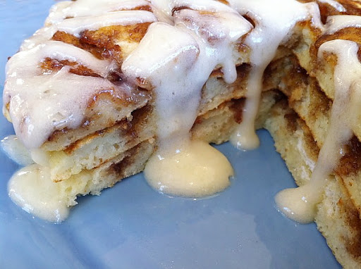 Prepare the glaze: In a small pan, heat the butter over low heat until melted. Turn off the heat and whisk in the cream cheese until it is almost smooth. Sift the powdered sugar into the pan, stir and add in vanilla extract. Set the pan aside while you make the pancakes.