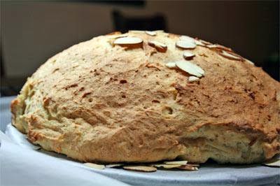 Sift your flours and dry ingredients together in the bowl of your stand mixer. In a separate medium bowl, combine beaten eggs, honey, melted butter, almond extract, vinegar, and warm carbonated water. Mix yeast with warm milk- make sure the yeast will proof then continue with recipe. If it doesn’t- start over with new yeast. Pour the egg/carbonated water mixture in the dry ingredients and combine. Add the yeast mixture. If you need to add more water, make sure it is room temperature. If your dough is too wet, add more gf flour mix. The bread dough should look like stiff cake batter and hold the twirls of the mixer. I used a 10 inch springform pan lined with parchment paper for this recipe. I greased the bottom of the parchment paper with a little almond oil before working with the dough. I used the almond oil to help shape the dough into a circular loaf. I let my loaf rise until doubled in bulk- about 1 1/2 hours. Yours my rise in less time depending on the environment of your kitchen. Don’t overproof the yeast because you want the bread to rise when it bakes. I wanted my bread to have a soft, pulled bread texture so I baked mine at 350 degrees for about 35 minutes. I topped my bread with a few sliced almonds for garnish. This bread is not suited for sandwiches, but makes an excellent breakfast or dessert bread.