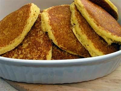 Lightly oil a griddle and heat over medium heat. For each pancake, the recipe recommends pouring about a 1/4 cup of the batter onto the griddle. I made my pancakes slightly larger. Cook for 2 to 3 minutes, until brown. Turn the pancakes and cook for about 2 minutes longer, or until browned on the second side. I kept my pancakes warm in the oven. My pancakes cooked a little faster than this on med. heat. I had to be quick on my toes with a toddler in tow!