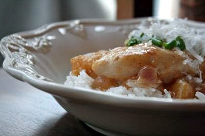 Prepare your chicken- cut into two inch pieces OR pound the chicken breasts between plastic wrap until flattened just a little. In a heavy, deep frying pan, melt the butter or heat the oil over med. heat. Brown the chicken on both sides. If using the 2 inch pieces, it will take about 3 minutes per side. Remove chicken from pan, but reserve the butter. Cook the onion for about 3 minutes; add garlic and stir for 1 minute. Return chicken to pan and add chicken broth, salt, ginger, chili powder, cayenne, curry, chopped peaches, and beer/wine. Stir to combine. Cover and simmer for about 15 minutes. Reduce heat to low (if not there already) and cook until chicken is tender when pierced with a fork.