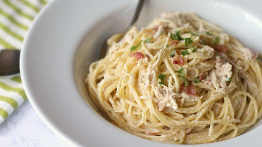 Just before serving, shred chicken with 2 forks, and toss creamy chicken mixture with cooked spaghetti.