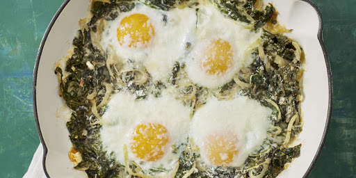 Stir in 2 Tbsp sour cream, 1 Tbsp grated Parmesan cheese, 1 tsp lemon juice, ¼ tsp coarse salt, and pepper to taste. Crack 4 large eggs on top.
