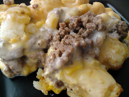 2. Spread beef mixture in bottom of a casserole dish. Layer soup, corn, Velveeta, and tater tots.
