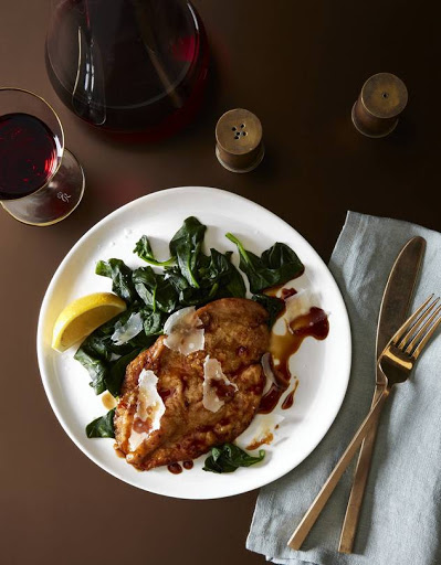 Serve chicken with sautéed spinach and drizzle everything with aged balsamic. Garnish with lemon wedges, if you like.