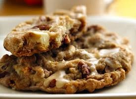 1. Heat oven to 350°F. In large bowl, break up cookie dough. Stir or knead in brown sugar, 1 1/4 teaspoons cinnamon, the ginger, nutmeg and orange peel until well blended. Stir in white chocolate baking bars, pecans and crystallized ginger. On ungreased cookie sheets, drop dough by 1/4 cupfuls 3 inches apart.