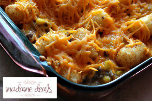Preheat your oven to 350 degrees. Grease a 9×13 pan and add a layer of tater tots to the bottom of the pan. Then add your beef mixture on top, then the remaining of your tater tots, and then top with 1 1/2 cups of cheese. Put your casserole in the oven and let cook for 25-35 minutes of until cheese is bubbly. (*Note- you can make this the night before and stick in the fridge to make the next day, it actually tastes great that way!)