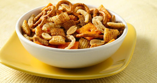 In large microwavable bowl, mix cereals, crackers and pretzels.