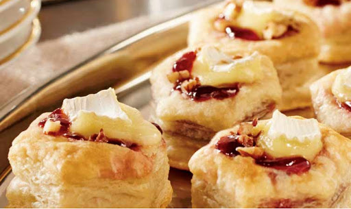 Heat oven to 350 degrees F. Spoon 1/4 teaspoon jam and place 1 piece Brie cheese into each pastry cup. Sprinkle with the pecans. Place the filled pastry cups onto a baking sheet.