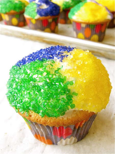 Spread each cake with icing, and immediately dip in gold, purple, and green sparkling sugars, covering about 1/3 of the cupcake with each color sugar.
