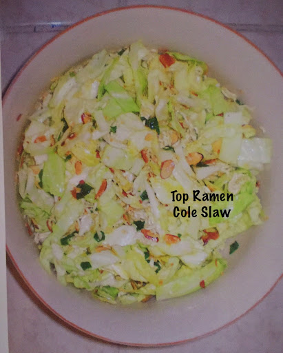 3. In a lrg bowl mix main ingredients together except top ramen noodles, almonds