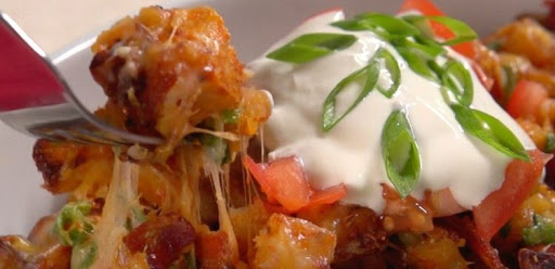 Preheat oven to 400 degrees.In a large bowl, combine the olive oil, salt, pepper, paprika, garlic powder and hot sauce. Add the potatoes and chicken and stir to coat evenly. Place the potatoes and chicken in a 9×13” baking dish and bake for 1 to 1 1/2 hours, until cooked through and browned and crispy on the outside.While the potatoes are baking, in a small saute pan fry up the diced bacon until crispy and brown. Remove from pan to a paper towel lined plate, reserving for later.Once potatoes are done remove from the oven and top with the cheese, bacon and green onion. Return to the oven for an additional 5 minutes to melt the cheese.Serve with diced tomatoes and a dollop of sour cream, if desired.Recipe slightly adapted from Singing through the Rain