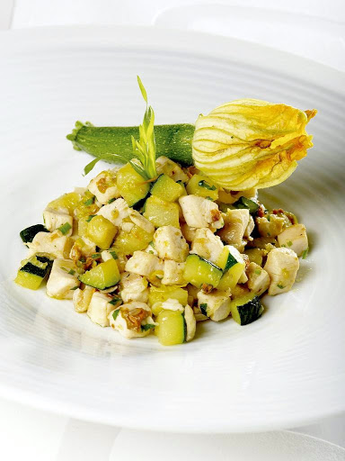 Cut the zucchini flowers into very thin strips. When the chicken and zucchinis are cooked, add the zucchini flower strips along with the fresh tarragon leaves.