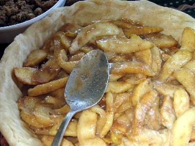 Prepare a pie crust then arrange sliced apples in it. Cover with softened margarine. Combine sugar, flour and spices then sprinkle on apples. Top with a prepared crush and bake as directed.