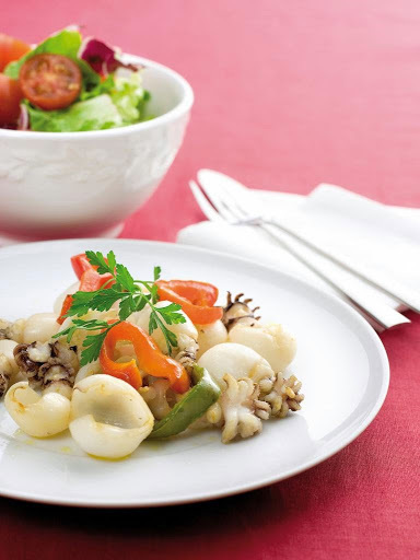 Wash and trim the cuttlefish and season with salt. Peel and finely chop the garlic. Place the garlic, the pepper cut into strips, the chilli pepper and the olive oil in the ActiFry and leave to cook for 10 minutes.