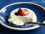 Dip each ramekin three-quarters of the way in warm water and invert onto a plate. Garnish each panna cotta with strawberries and mint, if desired.