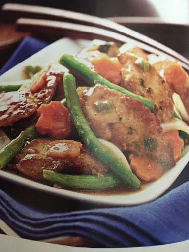 Heat remaining 2 Tbsp. oil over high. Add scallions, ginger, and garlic; stir-fry 30 seconds. Add green beans; stir-fry 2 minutes. Add carrots; stir-fry 2 minutes. Add onions; stir-fry 2 minutes. Return chicken to wok; stir-fry 1 minute to heat through. Stir in hoisin mixture to coat.