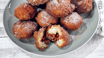 Use an ice cream scoop to portion dough. Add a teaspoon of apple mixture in the center, close the biscuit and drop into frying oil. Allow to fry until golden brown, about 5-7 minutes. Remove from oil and dust with cinnamon sugar.