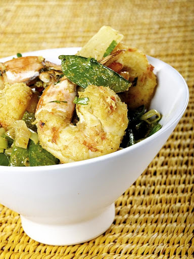 Add the prawns and the fish and cook for 5 to 6 minutes. Serve with the cooked white rice.