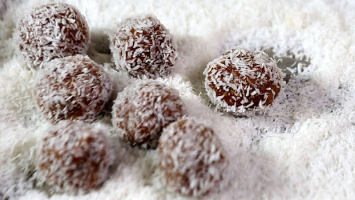 3. Spread the coconut flakes on a large plate or jelly roll pan. Roll the dough, 1 heaping tablespoon at a time into a ball; roll in the coconut to coat evenly. Store in an airtight container at room temperature.