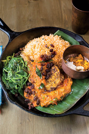 This chicken dish, infused with the curry flavor of garam masala, coriander, and turmeric, originated in the port city of Savannah, the result of the spice trade and a naval captain's memories of India. Asha Gomez's Country Captain demonstrates the interconnectedness of southern India and Atlanta--her two Souths.