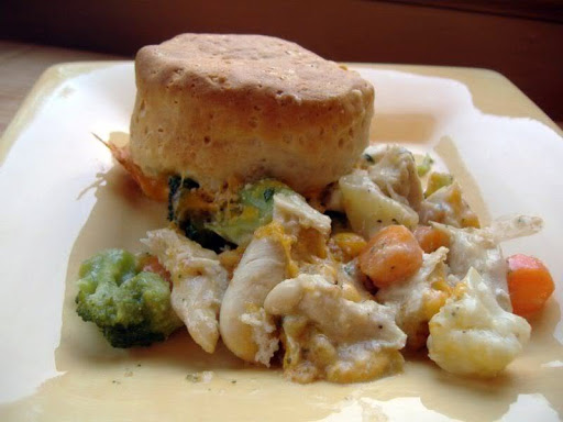 5. Bake until biscuits are golden brown and the sauce is bubbly approximately 20 minutes longer. Serve immediately.