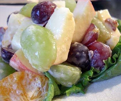 Mix all ingredients well. Refrigerate overnight. For a larger or smaller salad there is no need to change the amount of cream mixture.
