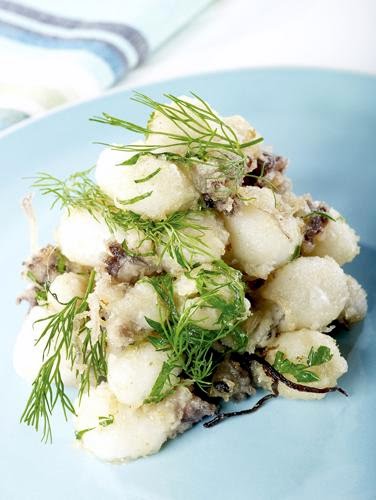 Clean the squid. Season and coat with flour. Remove any excess flour.