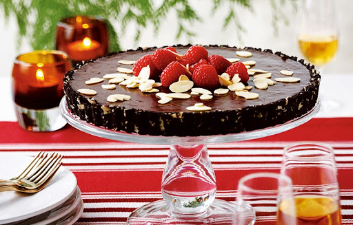 When mixture is smooth, pour into chilled shell. Leaving uncovered, refrigerate 3 hours. Decoratively place almonds around outer 2 inches (5 cm) of pie; lightly cover with waxed paper or plastic until needed. Refrigerated pie keeps well for 2 days. Serve cold, garnished with fresh raspberries or offer a small glass of raspberry wine.