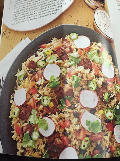 Combine chili powder, cumin, coriander, salt, and black pepper in a large bowl. Add chicken and toss to coat. Heat 2 Tbsp. oil in a 12-inch skillet over medium until shimmering. Add chicken and brown on all sides, 5–6 minutes. Transfer chicken to a plate. Heat remaining 1 Tbsp. oil in same skillet over medium. Add onion, bell pepper, garlic, and minced serrano; cook 1–2 minutes. Stir in rice and cook 1 minute. Add broth, scraping up any brown bits, and bring to a boil. Return chicken to skillet, cover, reduce heat to low, and cook until chicken is cooked through and rice is tender, 20 minutes. Stir in beans, minced cilantro, and lime juice. Garnish chicken and rice with radishes, tomato, sliced serranos, and cilantro leaves.