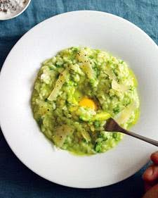 Reduce heat and stir in asparagus. Season with salt and pepper and add 1/4 cup broth. Simmer, stirring constantly, adding broth, 1/4 cup at a time, until rice is tender. Remove from heat and stir in grated cheese, remaining 3 tablespoons butter, and asparagus puree. Divide evenly between serving bowl and crack a quail egg into each. Garnish with shaved asparagus tops and cheese; serve immediately