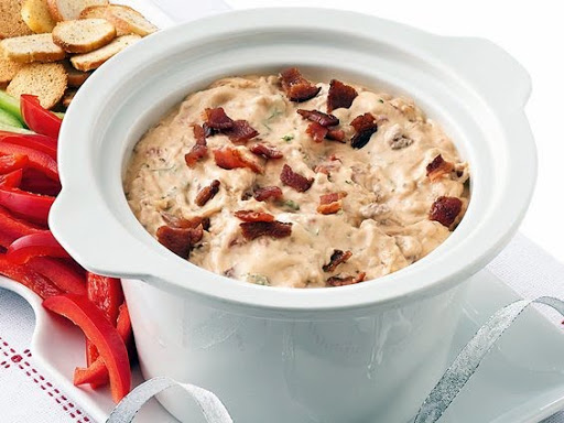 4) Stir parsley into dip. Sprinkle with reserved bacon for garnish. Keep on Low heat setting to serve. Serve with bell pepper strips and bagel chips..