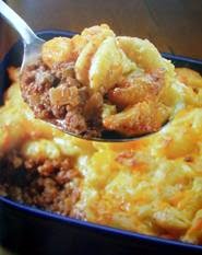 Grease up a 9’ x 13” baking pan. Spread the ground beef mixture in the pan, and then spread the mac ‘n’ cheese over it. Top everything with the last cup of Cheddar, and pop it into the preheated oven to bake for 30 to 45 minutes, or til the cheese sauce bubbles around the edges. Let the dish rest for 15 minutes before serving – if people can wait that long to eat it.
