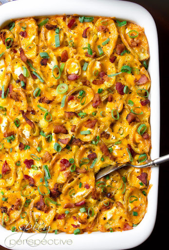 Mash the hot, scooped potato with melted butter, 2/3 cup crumbled bacon, 2/3 cup green onions, sour cream, 8 oz, cream cheese and sliced olives.