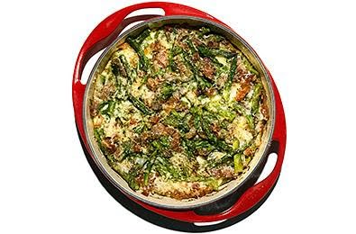Top with the Parmesan and bake until the eggs are set into a custard and a golden-brown crust forms on top, about 35 minutes.